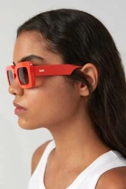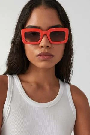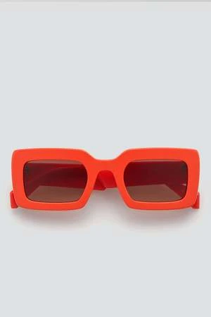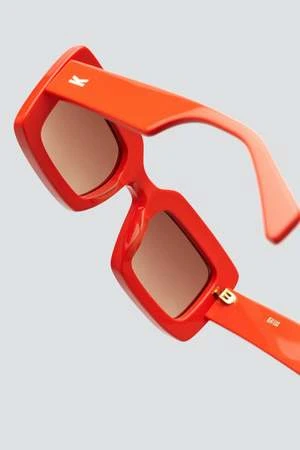 Sunglasses in monochrome thick orange acetate. Rectangular shape. Acetate arms with laminate logo on right arm. Orange gradient tint 2-base lenses with 100% UV protection and anti-reflective treatment. Built-in acetate nose pads.