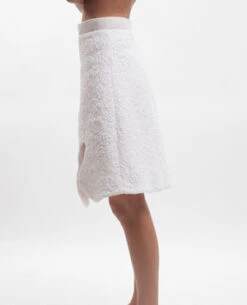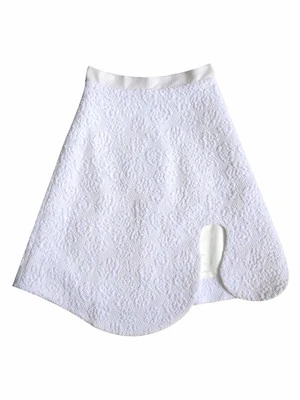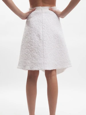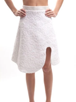 Structured white skirt with curved slit, ribbed waist band and hidden back zipper. Featured in a beautiful textured brocade fabric.
