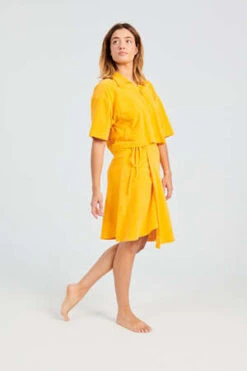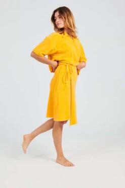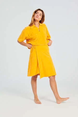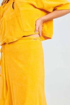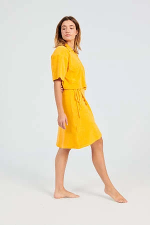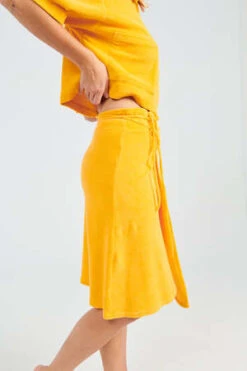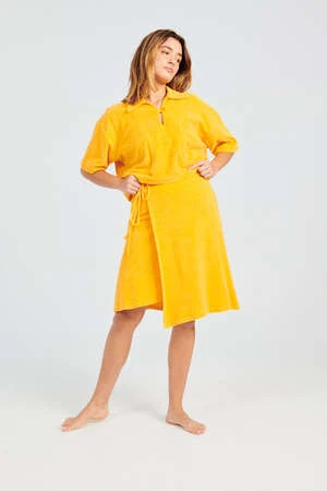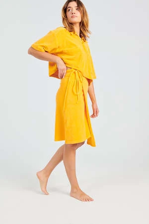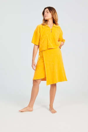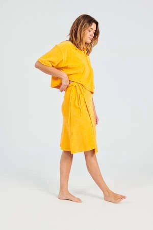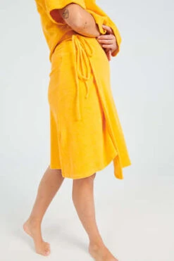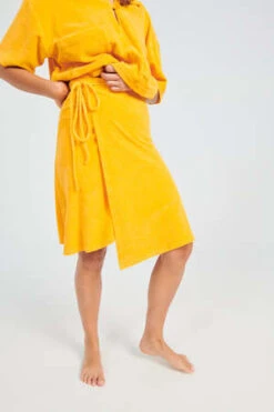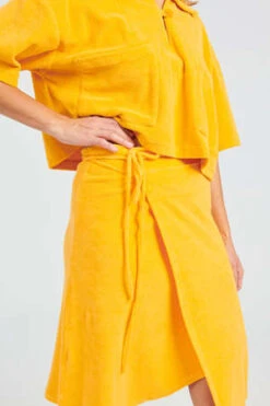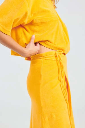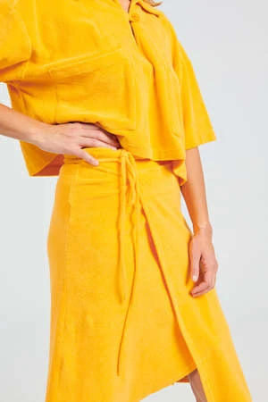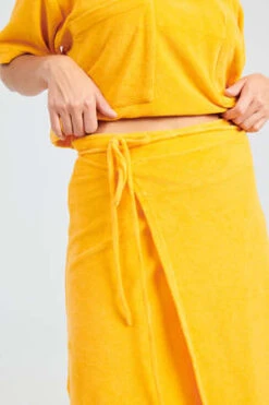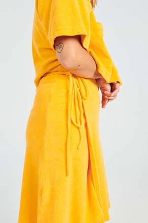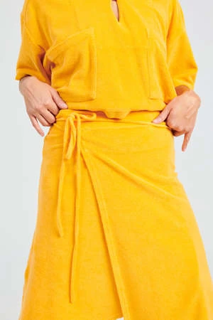 Cotton towel terry wrap skirt. Extra long ties for exaggerated wrap details. Pair with Kk Co’s Lake Top.