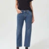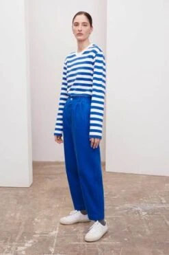 Unisex jeans with a tapered leg and an elasticated waistband for a relaxed fit. They feature front pleats, have both side seam and back patch pockets, and are fastened with nickel-free tacks in a concealed front fly .