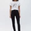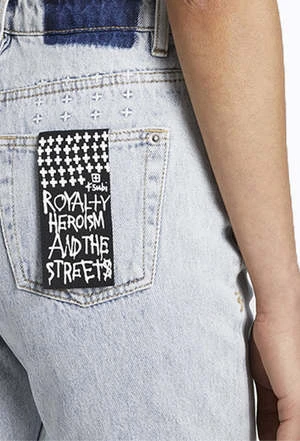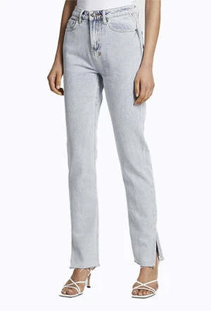 The Melrose Muse Split is a high rise pair of jeans that has a slim cigarette fit and full length with a side seam hem split. It is made from premium rigid denim in a washed out blue with heavy stonewash. This style features light grinding, Ksubi t-box print and back cross embroidery.