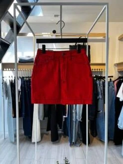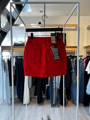 This is a pencil-fit mini skirt with a super high rise, topstitch detailing and contrast panels.