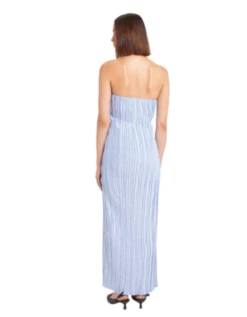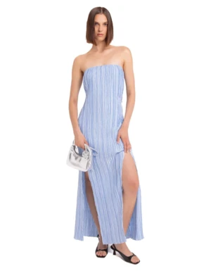 Off-the-shoulder long dress with a satin, pleated texture. Side slits at the hem and an invisible side zip fastening