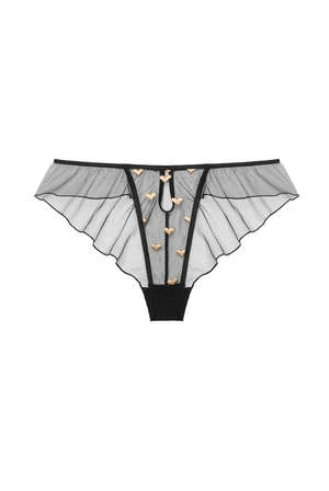 Loose mid rise briefs made of material in embroidered gold hearts pattern with 3d effect. Small, thin opening at the back.