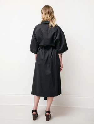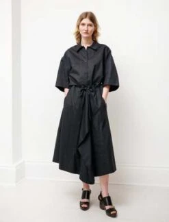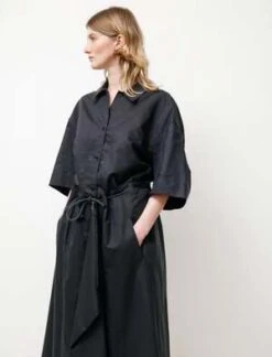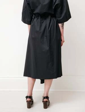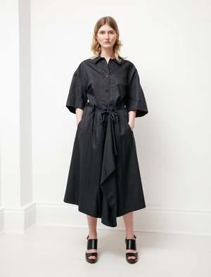 An elegant, draped a-line silhouette adorned with a cinch cord waist. This skirt is light and breezy, cut from a cotton-silk blend that gives it a subtle lustre and dry feel. Finished with two welt pockets at the waist and viscose lining for some added weight through the body in classic black.