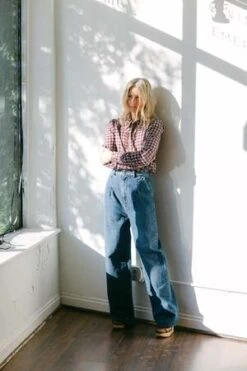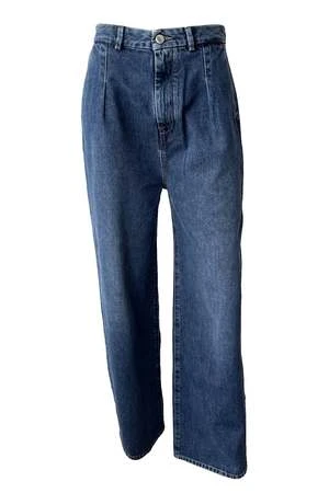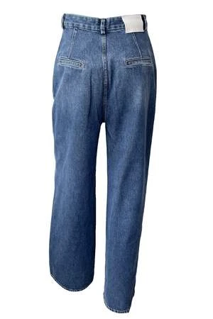 These jeans by Loulou Studio features a high rise and full leg with front pleating. These are a heavy weight denim.
