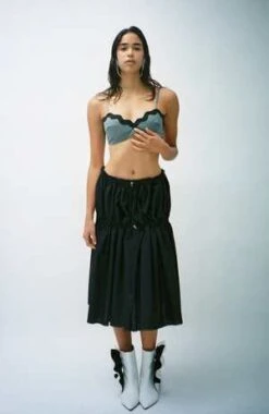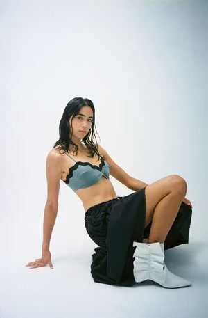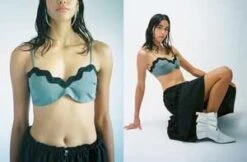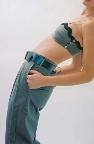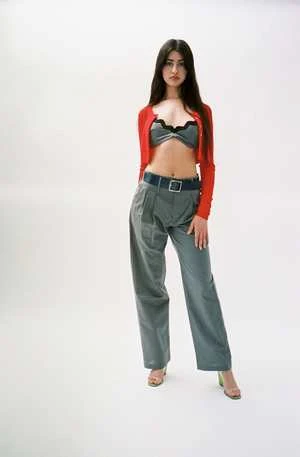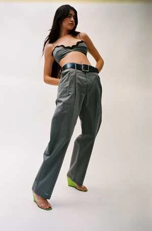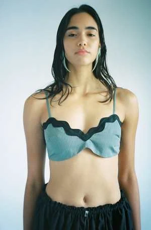 A Maimoun exclusive. A bra top in a vertical stripe shirting fabrication with a contrast black scalloped neckline. Looped side button fastening. Fits true to size. Zadeh’s Fall Collection was inspired by her friends, the cool downtown types who wear fashion but have a sort of nonchalance about it; while focusing on beautifully crafted covetable pieces. Zadeh’s pieces feel like things you’ve had for years and will continue to style into a growing wardrobe. Worn with the matching Tidal Abdou Trouser and Carmen Cropped Cardi.