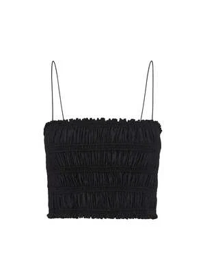 The shirred bodice camisole features a smoked tube top in satin with spaghetti straps that you can adjust and tie according to you liking. The square neckline is perfect for displaying layers of dainty necklaces. Style it with high-rise jeans and strappy sandals