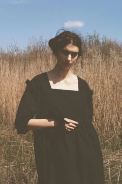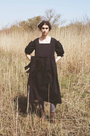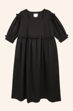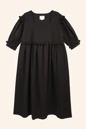 Midi-length dress with square neckline and wide cut for a relaxed fit. Dropped shoulder with voluminous elbow length sleeves that gather at the cuff. Finished with frill details.