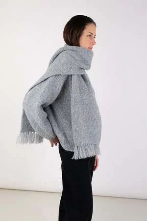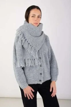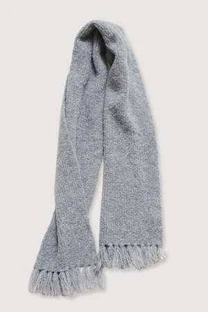 Highly textural, long scarf knit from Alpaca boucle yarn in mixed colors with fringe at the bottom.
