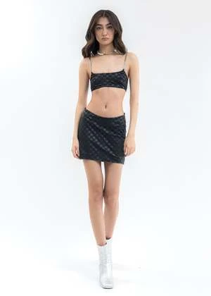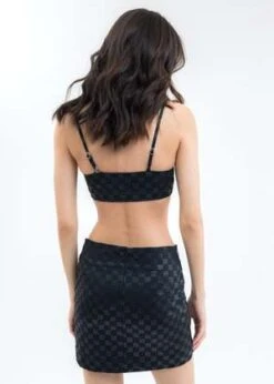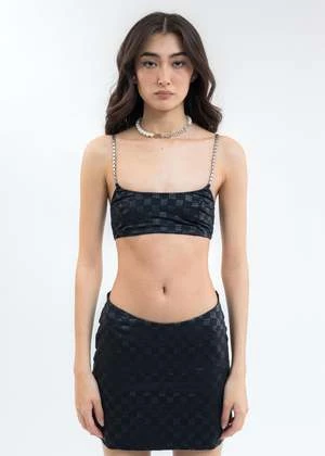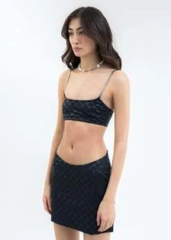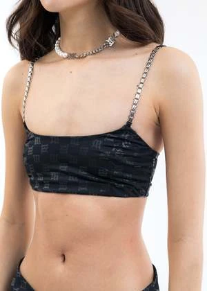 Slim fit monogram print stretch bralette in black. Paneled construction. Silver-tone cuban link shoulder straps. Finished with tonal stitching throughout. Adjustable shoulder straps.