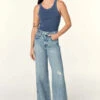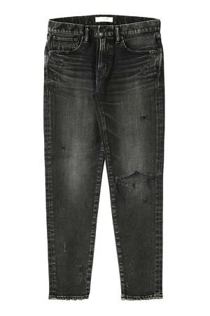 Black wash stretch denim with distressing at the knee. Mid rise sits high on hip. Five-pocket style.