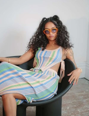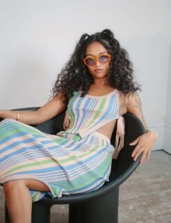 Midi length striped skirt from Mundaka Studio. Ribbed knit straight cut with elasticated waist. Pair with the knit rib top for a full ensemble.