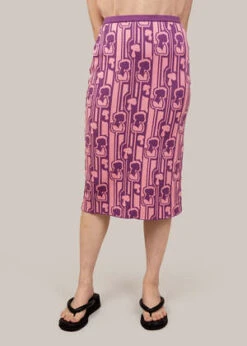 Midi length knitted skirt with pink and black champignon patterning throughout. Straight cut. Elastic waistband.