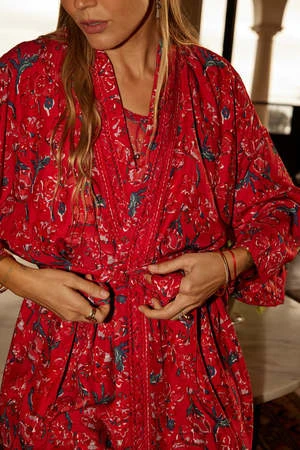 Short robe with a drop shoulder and full sleeves. Features two oversized pockets. Side slits hit mid-thigh.
