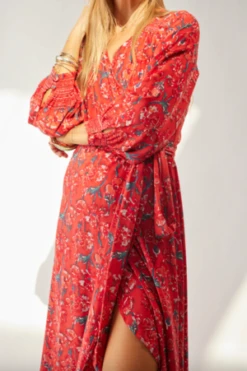 Long sleeve maxi dress with crossover wrap bodice and tie closure.