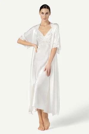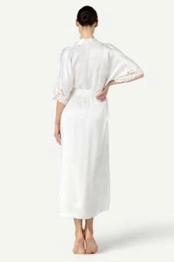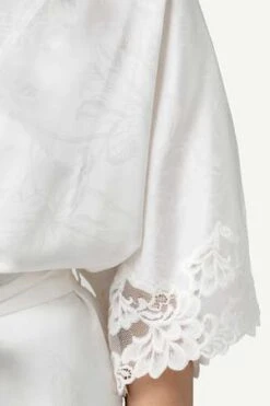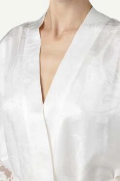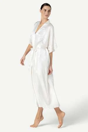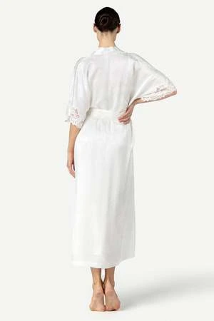 Look stunning in silk with this long white kimono that wraps the wearer in soft, sustainable fabric for sensitive skin. The Barbara Long Kimono displays pure craftsmanship with lace-trimmed sleeve openings while creating a timeless bridal silhouette that lasts beyond the wedding night. Pair it with the Barbara Long Gown for the most elegant look.