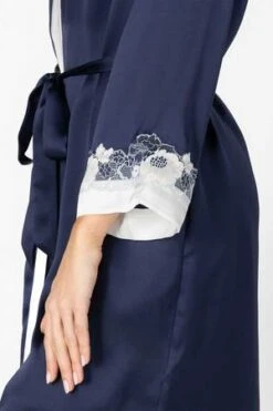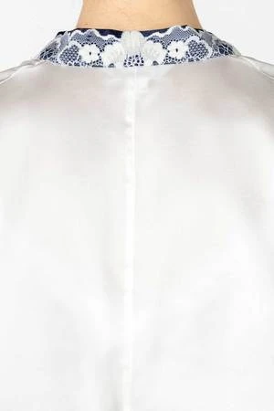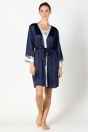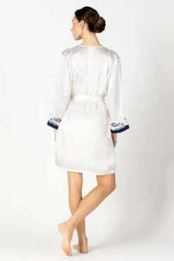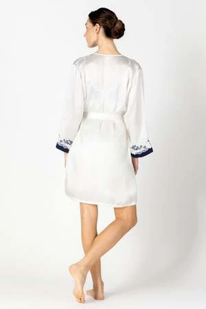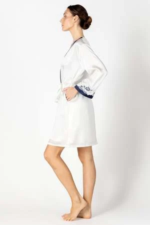 This blue and white robe is perfect for your bridal moment, from preparing to walk down the aisle to languid days spent on your honeymoon. The Marisa Charming Short Robe features impossibly soft, gentle silk with beautiful hand-cut lace details for a timeless look. Crafted by our family team of artisans, this robe is an iconic staple. Wrap this statement piece around the Marisa Charming Bust-Support Bandeau Chemise for the best in comfort.