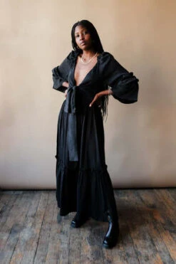 OHSEVENDAYS Bailey reversible dress in black. This dress is so versatile with a wrap style front or back, and an elasticated waistband. Features side pockets, and double side slits to show a bit of leg.