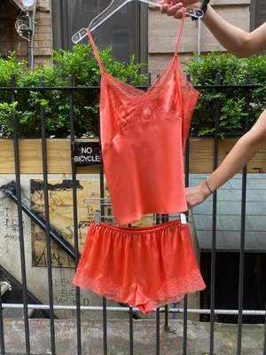 Lounging never looked better. A classic – silk tap shorts in a juicy coral orange with comfy elastic waistband. Lace trim around the leg holes.