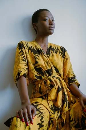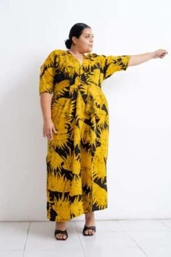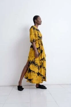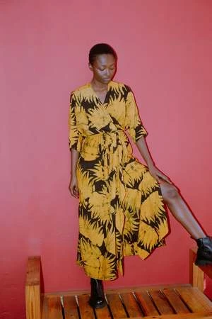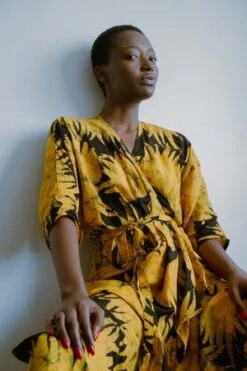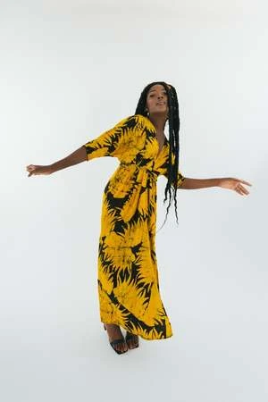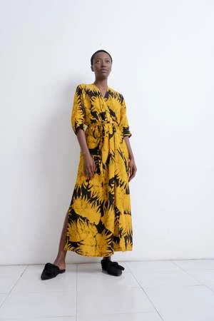 The Letsa is a long narrow wrap dress with batwing sleeves and a deep V neckline. This piece has soft pleats and a small cascade detail at the front waist. Ties wrap around the waist and the skirt opens at the side. Weve updated the Letsa with side slits for even more drama and ease of wearing, and a slightly wider waist tie. Hand dyed for maximal dramatics.