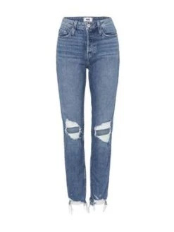 Be a casual queen in the Paige Hoxton Ankle Peg Jean in Novi Destructed. Constructed from a washed cotton blend these high rise jeans feature a covered button fly opening, front and back pockets, distressed detailing, rips at the knees and are finished with a raw chewed up hem for an ultra cool finish.
