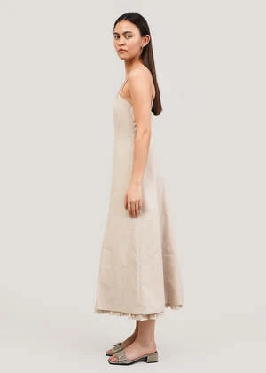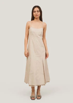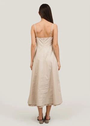 Strappy ecru dress featuring a fitted bust and flared double layered skirt. Zip entrance at back. Midi-length.