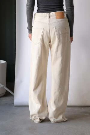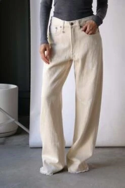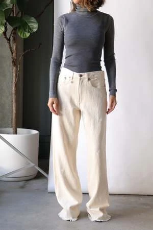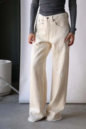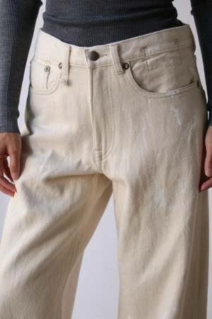 Relaxed wide leg jean with a classic five pocket styling, built with rigid Japanese ecru denim. The fabric features a loose knit and thick yarn giving it a knit-like feel. Treated with a simple stone wash and a light paint splatter effect.
