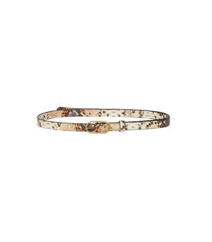 The Claud Belt in Brown Multi by Rachel Comey is a thin leather belt featuring an elongated, oval metal buckle with extra length for a stylized wrap effect crafted in a snake print leather.
