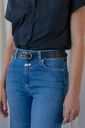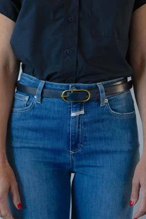 Navy leather belt with a fine, elongated oval metal buckle.