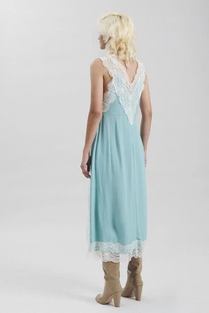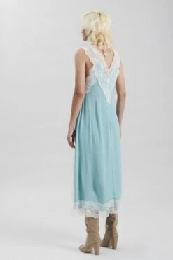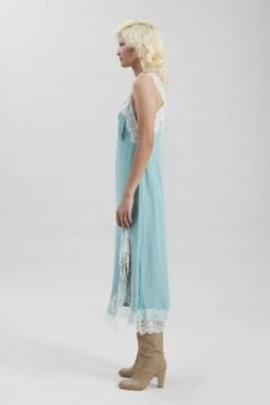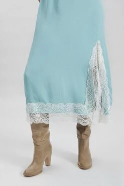 Slinky, V-neck maxi slip dress with empire waist and contrast lace trim, in Rachel’s new Terrano Crepe, which has a soft matte face and sleek satin back that feels like silk–without the static cling.