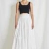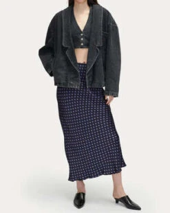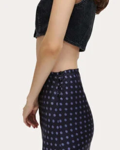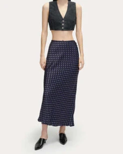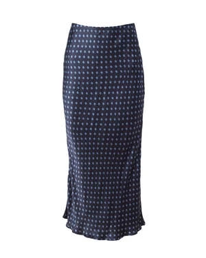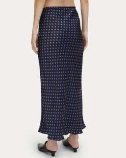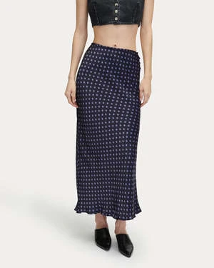 The Glass Skirt in Navy by Rachel Comey is a full length, bias cut skirt crafted in a dotted satin viscose featuring a purl mellow edge and elasticized waist.