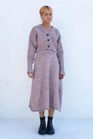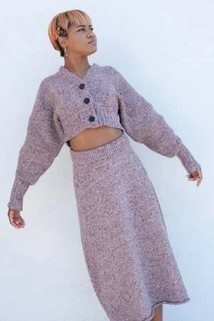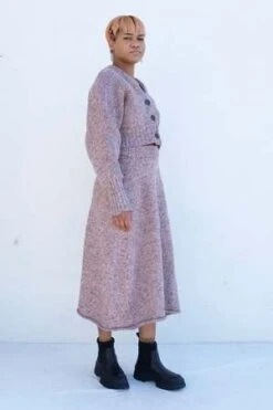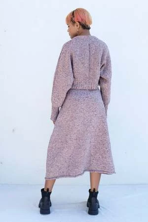 A high-waisted, cocoon shaped midi skirt with a rolled hem, in a new Italian recycled chunky tweed yarn. This multicolour knit has a tweedy texture and cozy, blanket-like feel.