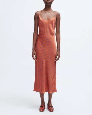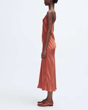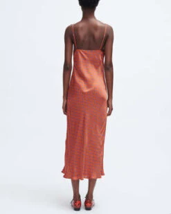 The Wren Dress in Orange by Rachel Comey is a midi length, bias cut slip dress featuring a scoop neckline and thin straps crafted in a polka-dot print.