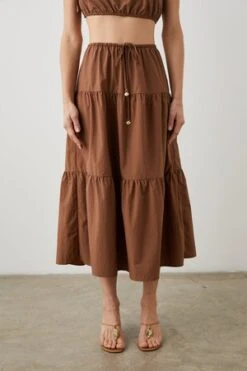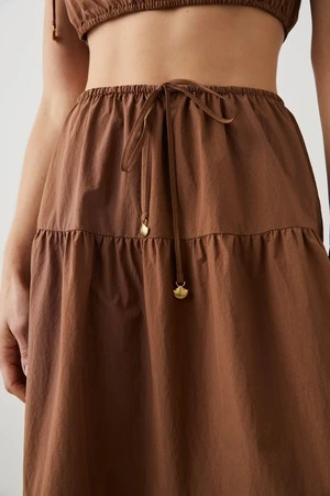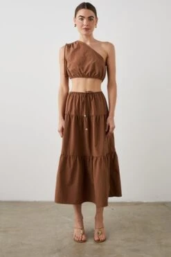 The Mary Skirt boasts a drawstring waistline that flatters any body type, a silhouette that is breezily appealing, and a mid-calf length for a sophisticated feel. Crafted from light brown tissue nylon fabric, this skirt offers an adjustable waistline to ensure a comfortable fit. Adapt the skirt to fit your style with a high or low waistline. Pair with the matching Kim top in Toffee to complete the look.