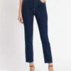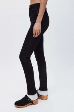 High rise fit sitting right below the natural waist and hitting at the ankle bone. Slim-fitted throughout with a little extra room at the leg opening.