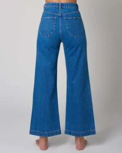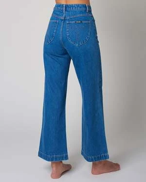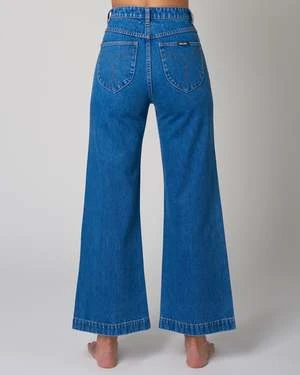 The Sailor Pant in Ashley Blue is a super high-rise, wide leg jean, made with a rigid denim. This fabric has no stretch so we suggest going up a size.