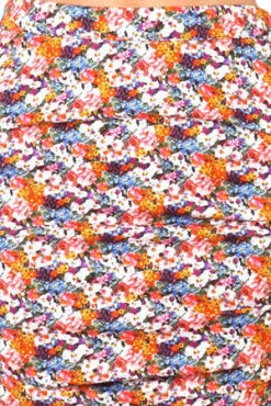 This beautiful vibrant mini skirt comes with soft side ruching on its denim floral print. A full side zip closure and side slit pockets add to its flirty nature.