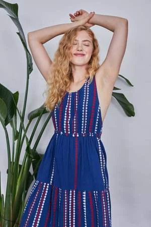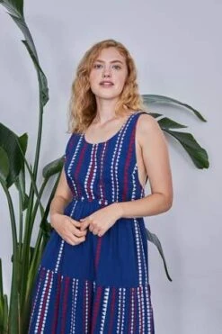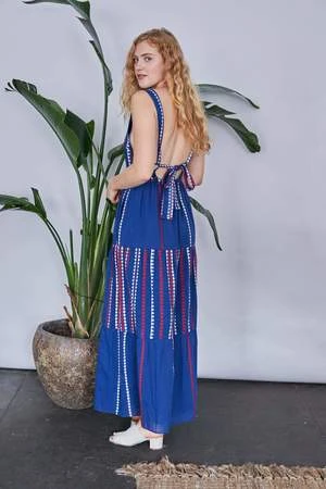 Gema Tier Dress in Iris Merida Stripes. Backless, tiered, flared maxi dress with elastic cinched high waist and hidden pockets. Ability to wear straps crossed, as pictured, or as regular straight straps. Length hits ankle. Basically, the perfect summer dress.