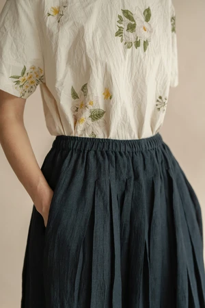 Holds your waist with just the right firmness. The lightweight handwoven cotton hangs on with multiple pleats to help it out.