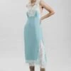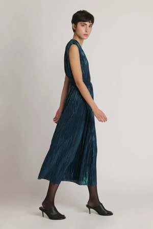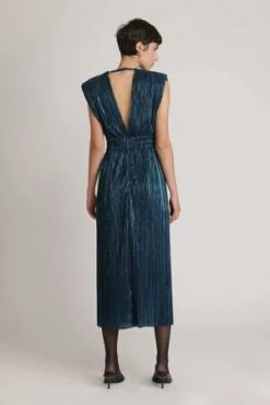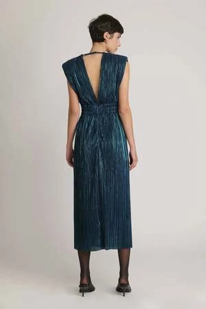 Pleated knit with foil sleeveless midi wrap dress featuring a deep V-neckline, shoulder pads and front slit. Draped fabric detail on front, and deep open back with adjustable strap and invisible zipper.