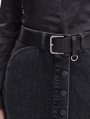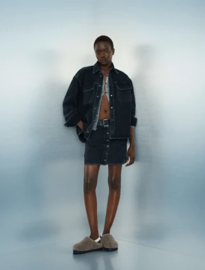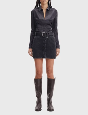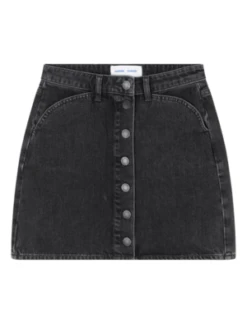 This mini denim skirt is the perfect partner for the coming hot season. Made from a soft washed black denim fabric, this skirts features curved twin front pockets, matt finished gunmetal grey buttons and a classic back yoke. Wear yours with a chunky sandal and ribbed tank top for an effortless summer look.