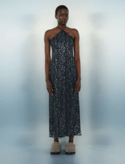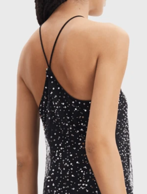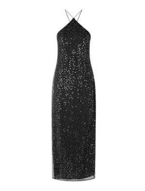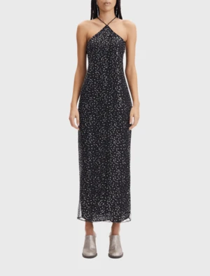You’ll sparkle like the night sky is the striking Ytzen party dress from Samsoe Samsoe. This midi dress is a reinvention of a classic halter style with thin spaghetti straps and a revealing cut away back shoulder. This gorgeous column shaped dress hits just above the ankle and is the perfect style for a chic party look this holiday season.
