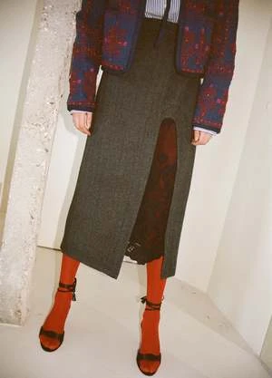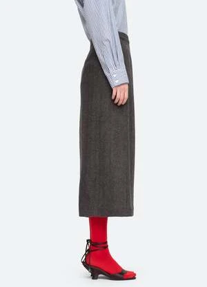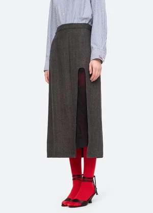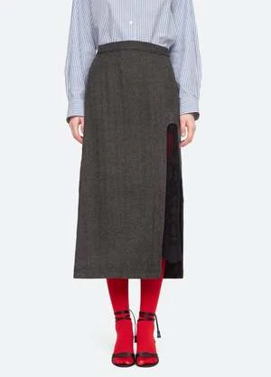 The Lucas suiting wool skirt features a high side slit with lace trim.