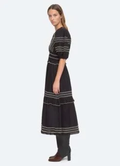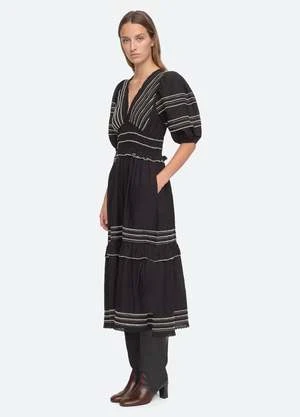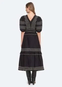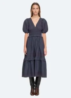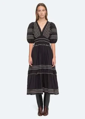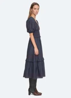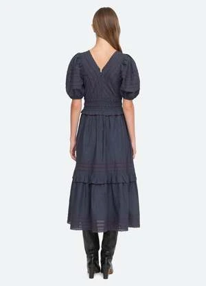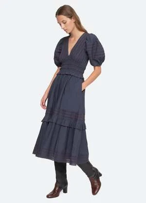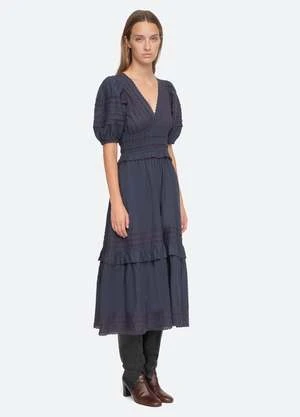 The Mable midi dress features a v-neckline, puff sleeves, pleated detailing, lace trim and smocking.