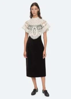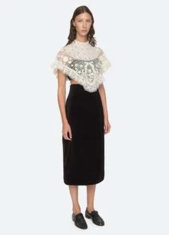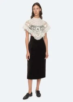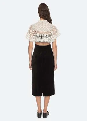 A perfect match. The Serita 3 piece set features an intricate crochet lace cape, bralette and high waisted velvet skirt.