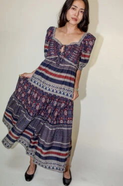 – The Tasha print tiered dress features a smocked bodice with keyhole front, thin halter neck tie and short puff sleeves.