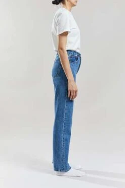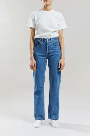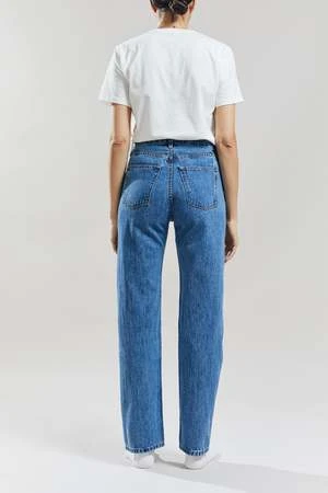 Still here Childhood jeans in Classic Blue is inspired by the “anti-fit” simplicity of your favorite childhood jeans. It’s a relaxed leg, super hi-rise, wedgie fit. It features a traditional button fly and our signature ‘SH’ embroidery. The Childhood is our original cool-girl jean.
