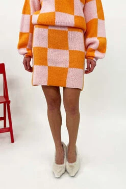 Check please! This Andria skirt in Sunset by Stine Goya is a stretchy knit mini skirt with a fitted silhouette, high elasticated waist and bright two tone checked pattern. Pair the Andria Knit Skirt with the Adonis Knit Sweater in Sunset and the Clara Hat in Sunset for the ultimate check knit set.