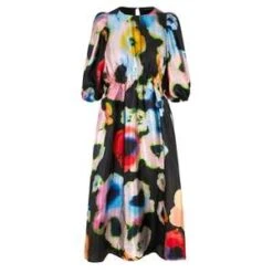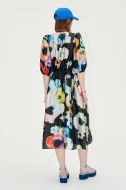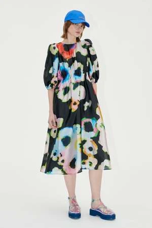 A flowing midi dress with high cinched waist, pockets and puffed short sleeves. Recycled polyester blend.
